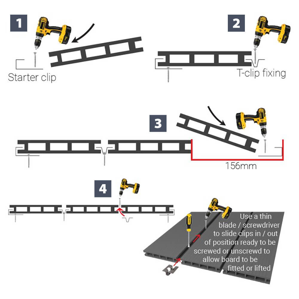 Using our starter clips and T-clips is easy. We recommend using a log narrow Philips or PZ2 drill driver bit suitable for the screw head for easy installation. Starter clips come in packs of 10, while Board fixing T-clips come in packs of 50.